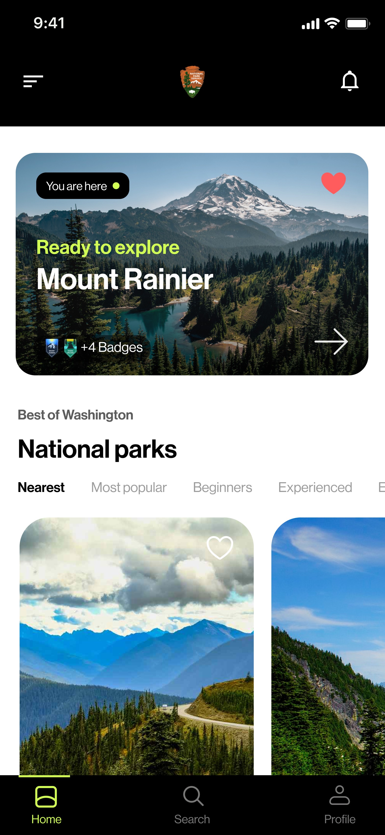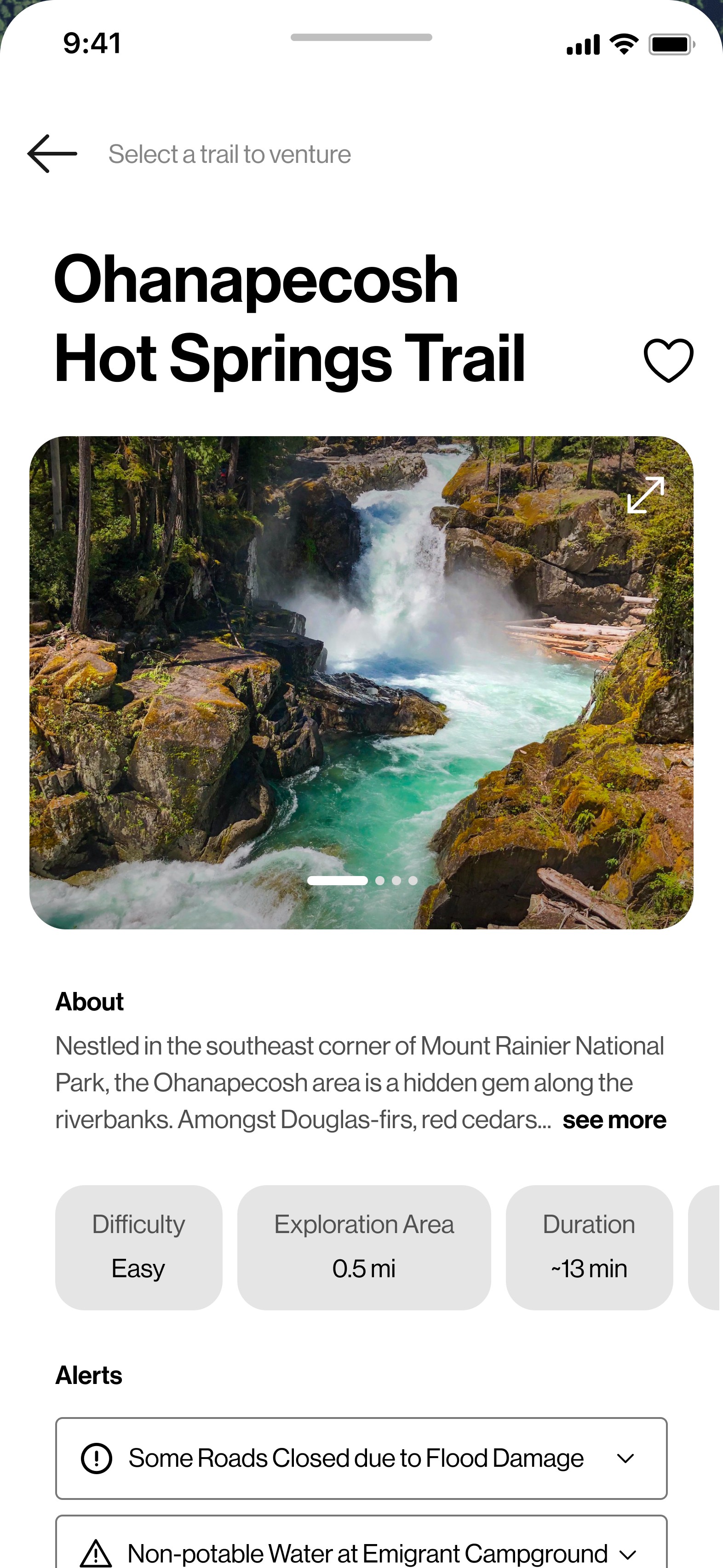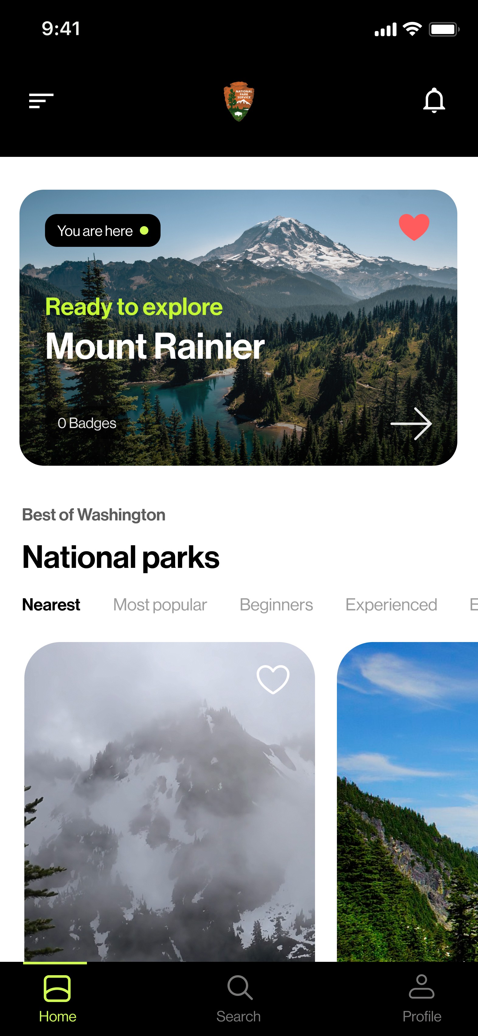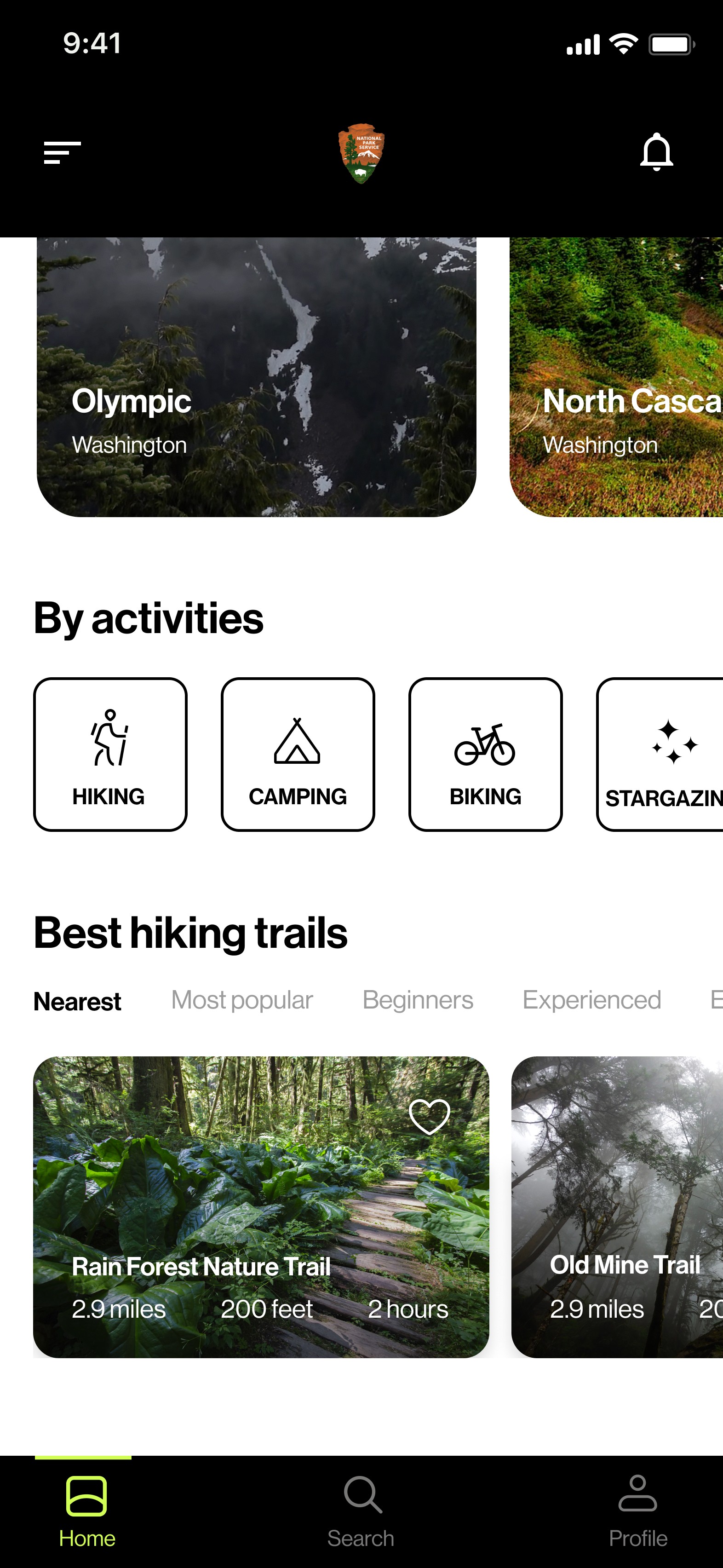 Nested pages for information was a big problem we identified from our competitive audit, so we wanted to keep our app as simple and navigable as possible. We created only three main tabs — home, search, and profile — and kept descriptions, alerts, and logistical information about parks on one page to avoid excessive navigation and prevent confusion.