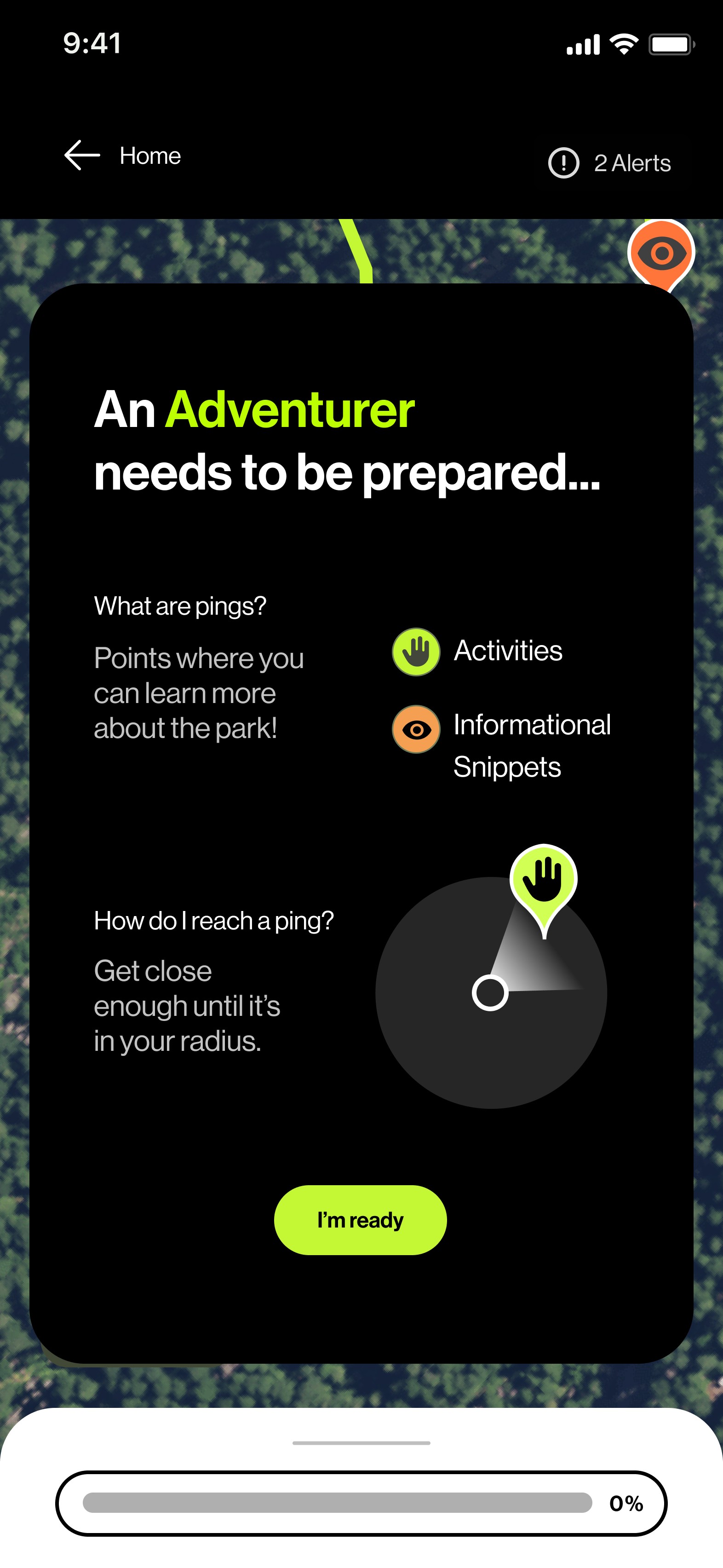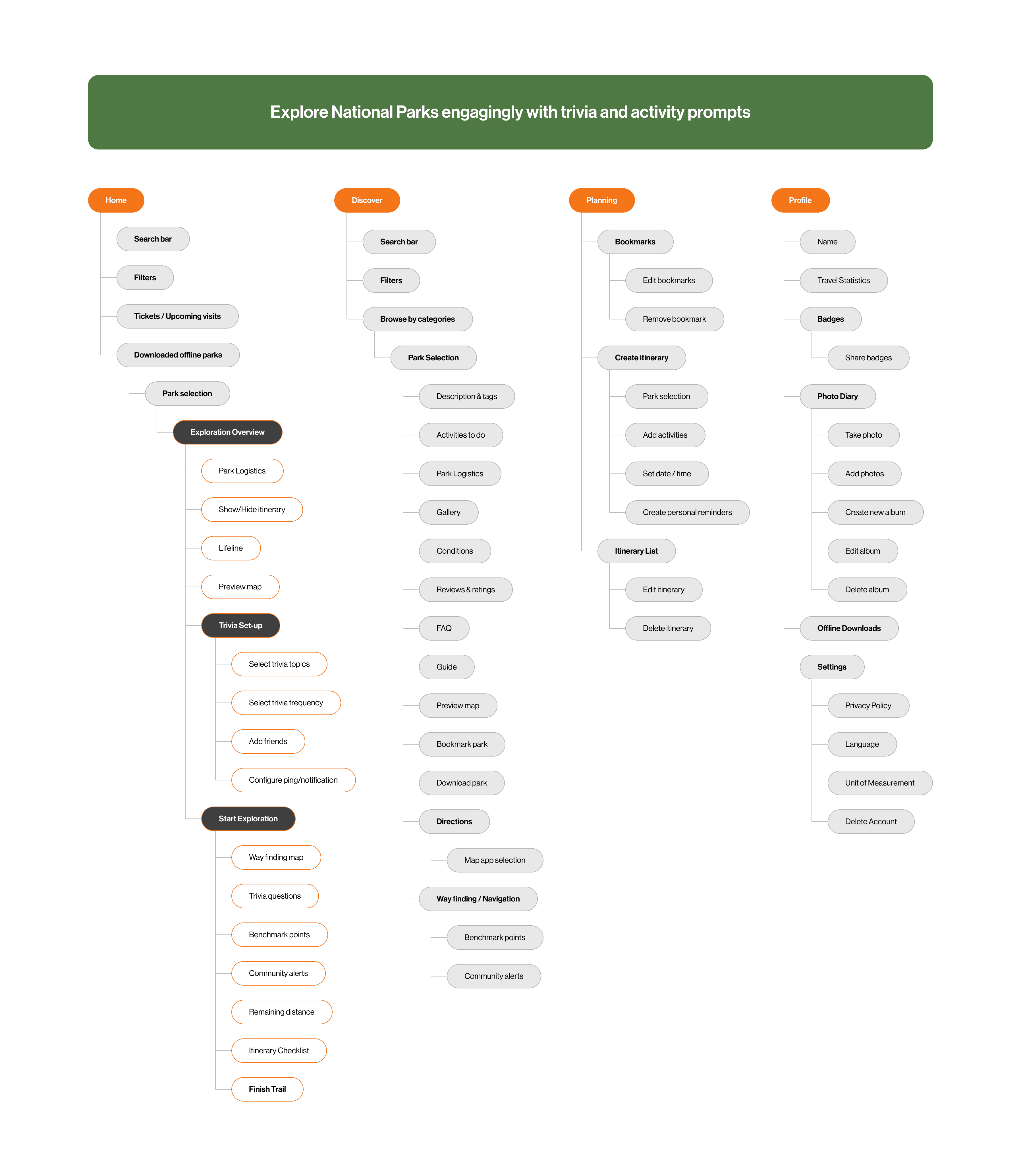 The first one addresses how convoluted and unenjoyable information is on National park apps; how might we make them exciting, digestible, and memorable? Then, what features might entice never-before tourists go to and feel capable exploring the park? Visitors hope to connect with nature and get a vacation from their screens — how can we ensure the app isn't overpowering and demand more attention than it needs?